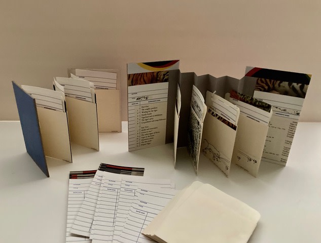 There will be demonstrations and instruction on a variety of ways of using the accordion fold in a book format: as a panel, as individual pages, as a board book and as a book spine. After creating samples, students will be guided in choosing a format for displaying old school library pockets and their removable cards and adding text or images if desired. You might even use reclaimed book covers to finish your book. Students will leave with samples of accordion books and a completed artist book of your own!