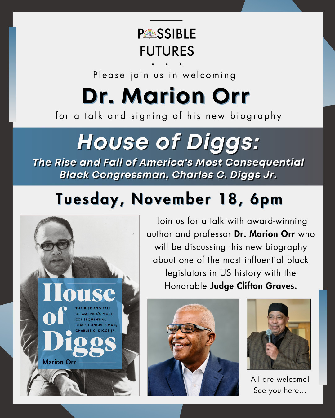 Join us for an important discussion about the life of one of the most influential black legislators in America through the biography written by Dr. Marion Orr , House of DiggsThe Rise and Fall of America's Most Consequential Black Congressman, Charles C. Diggs Jr. Dr. Orr will be in conversation with the honorable Judge Clifton Graves. Come learn with us!