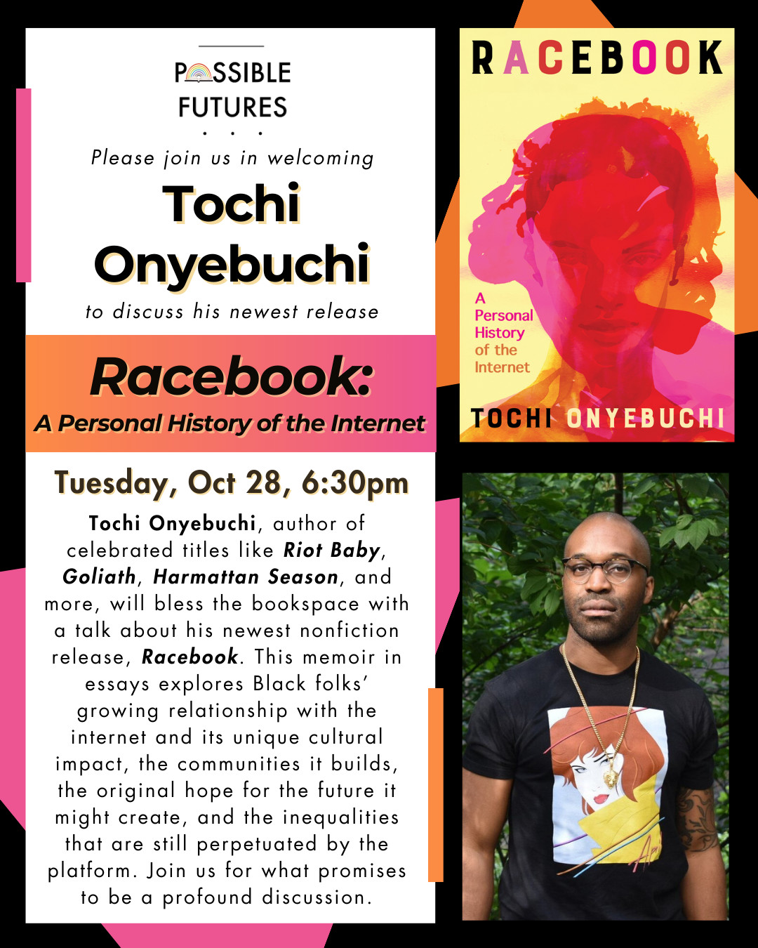 Tochi Onyebuchi , author of celebrated titles like Riot Baby, Goliath, Harmattan Season, and more, will bless the bookspace with a talk about his newest nonfiction release, [Racebook: A Personal History of the Internet](https://www.possiblefuturesbooks.com/item/wLubr6H3tUamkwaLq__WA)_. This memoir in essays explores Black folks’ growing relationship with the internet and its unique cultural impact, the communities it builds, the original hope for the future it might create, and the inequalities that are still perpetuated by the platform. Join us for what promises to be a profound discussion.