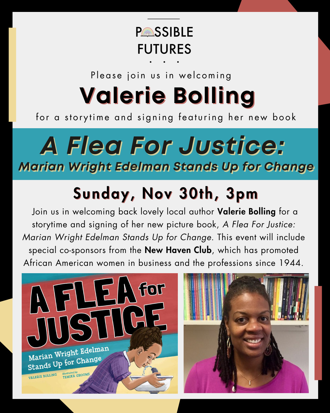 Join us in welcoming back lovely local author Valerie Bolling for a storytime and signing of her new picture book, A Flea For Justice: Marian Wright Edelman Stands Up for Change. This event will include special co-sponsors from the New Haven Club, which has promoted African American women in business and the professions since 1944.