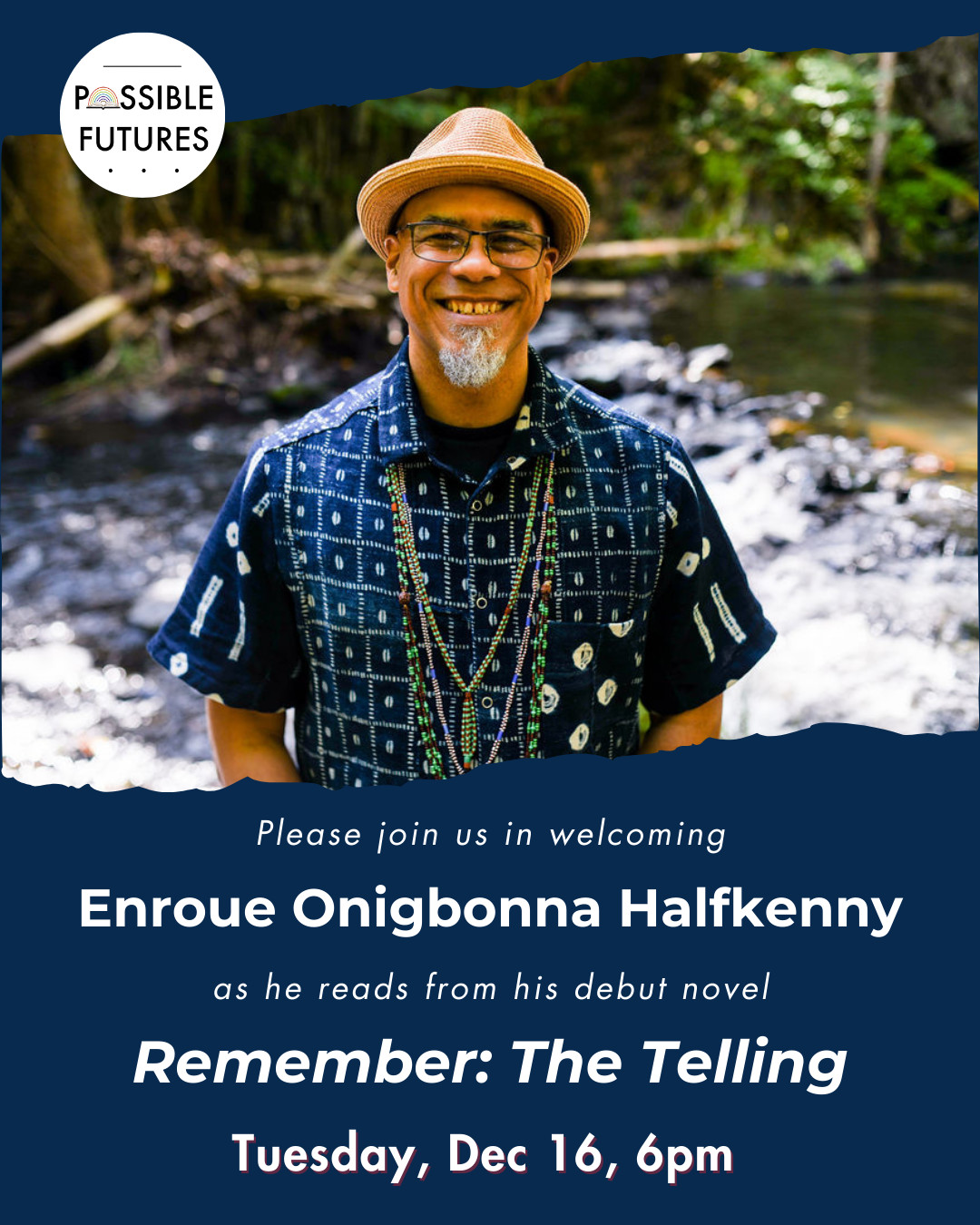 Beloved community member Enroue Halfkenny is ready to read for us from his debut Remember: The Telling , an epic, speculative fiction novel that draws upon Yoruba cosmology, the power of story telling, and the individual and collective consequences we face in choosing to remember, or to forget, who we truly are. Please join us in support of Enroue!